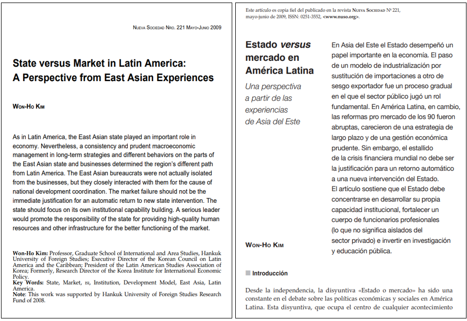 “Korea and Latin America: End of a Honeymoon?” Capitulos 56 (May-August 1999), pp. 122-135. PDF (English). “¿El fin de la luna de miel entre Corea y Latinoamerica? Capítulos 56 (Mayo-Agosto 1999), pp. 132-147. PDF (Spanish)
