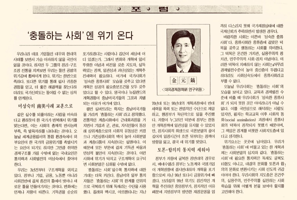 [Column] “‘충돌하는 사회’엔 위기 온다” (Crisis looms in a conflicting society), 문화일보. 2000/11/14.