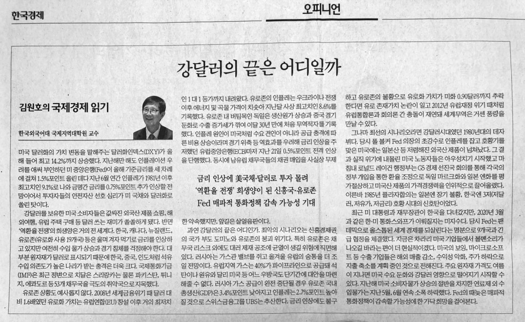 [Column] “강달러의 끝은 어디일까” (Where will the super dollar end?), 한국경제신문. 2022/7/25. ESPAÑOL