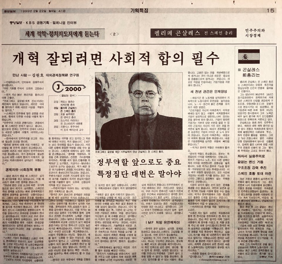 [Interview] “[세계석학.정치지도자에게 듣는다] 펠리페 곤살레스” (Interview with Felipe Gonzales), 중앙일보. 1999/2/22. SCAN